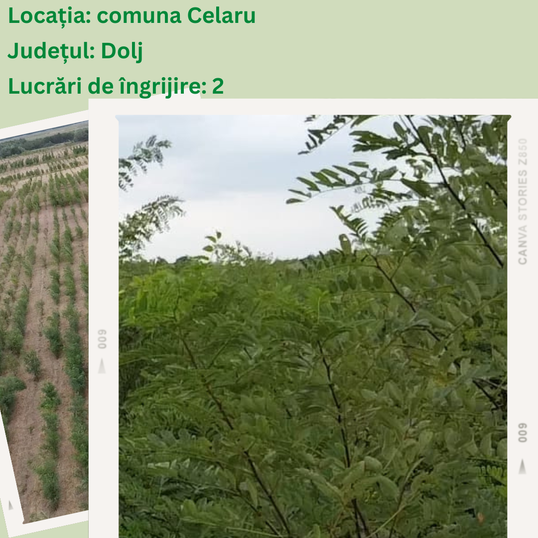 Comuna Celaru, jud. Dolj – 25.3 hectare de teren deșertificat, cea mai mare suprafață de teren în curs de ameliorare prin împădurire din cadrul programului „Adoptă un Copac!”, plantată în toamnă 2020 (15.3 hectare) și primăvară 2021 (10 hectare). Puieții de pe toată suprafața au beneficiat de activități de îngrijire. Dezolvatarea lor ne bucură și ne oferă speranțe de viitor pentru reabilitarea solului sever afectat de fenomenul deșertificării (dupa cum se poate observa și din imagini).